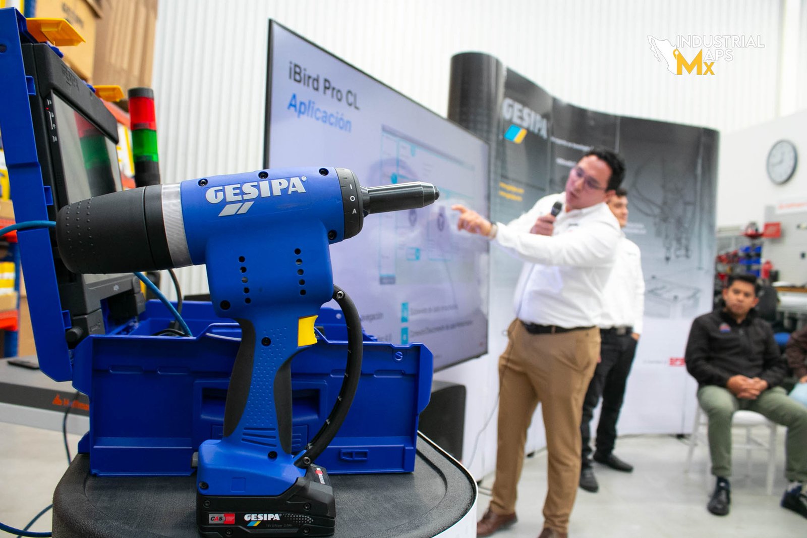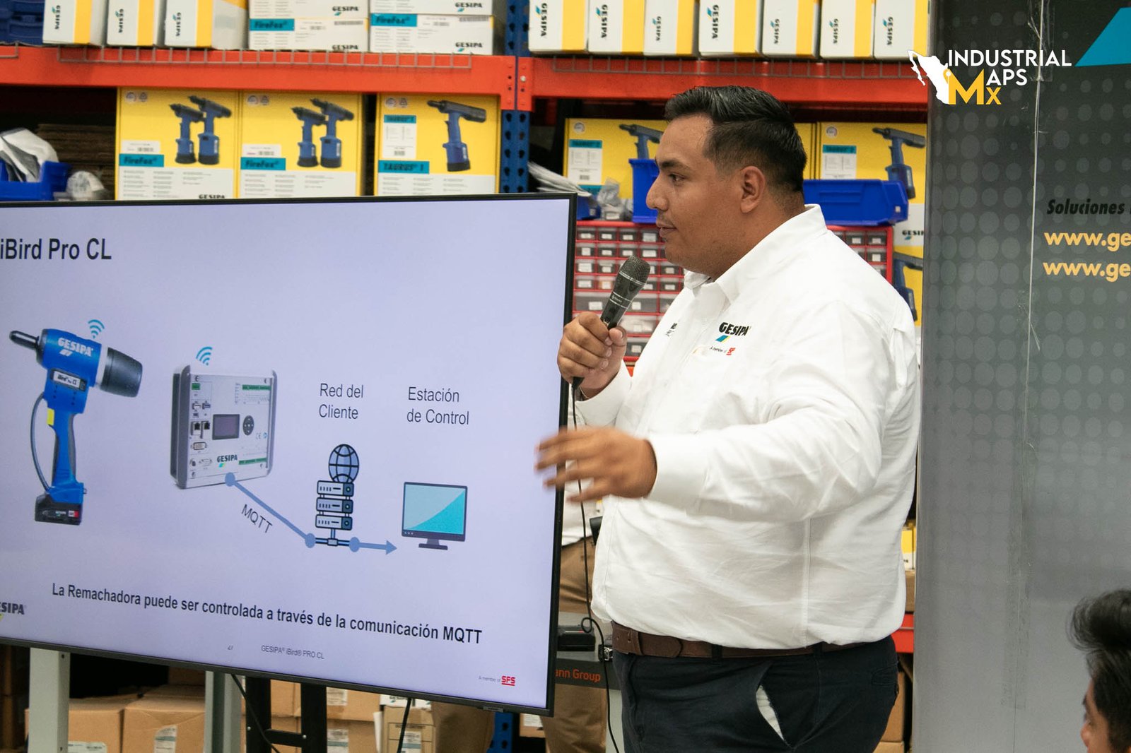 Dentro del evento se realizó la presentación de la herramienta Pro CL, una remachadora eléctrica inteligente con conectividad para entornos de industria 4.0. Pablo Muhlia, Ingeniero de Servicio Técnico en GESIPA, explicó en detalle sus capacidades: monitoreo en tiempo real, bloqueo automático ante errores de instalación o contenedor lleno, mantenimiento predictivo y comunicación inalámbrica con protocolos industriales como MQTT y Profinet. Esta herramienta permite conectar hasta tres dispositivos a una sola interfaz, optimizando procesos y reduciendo costos operativos.